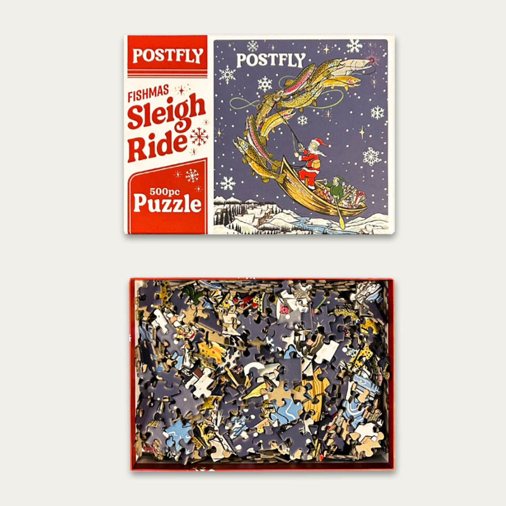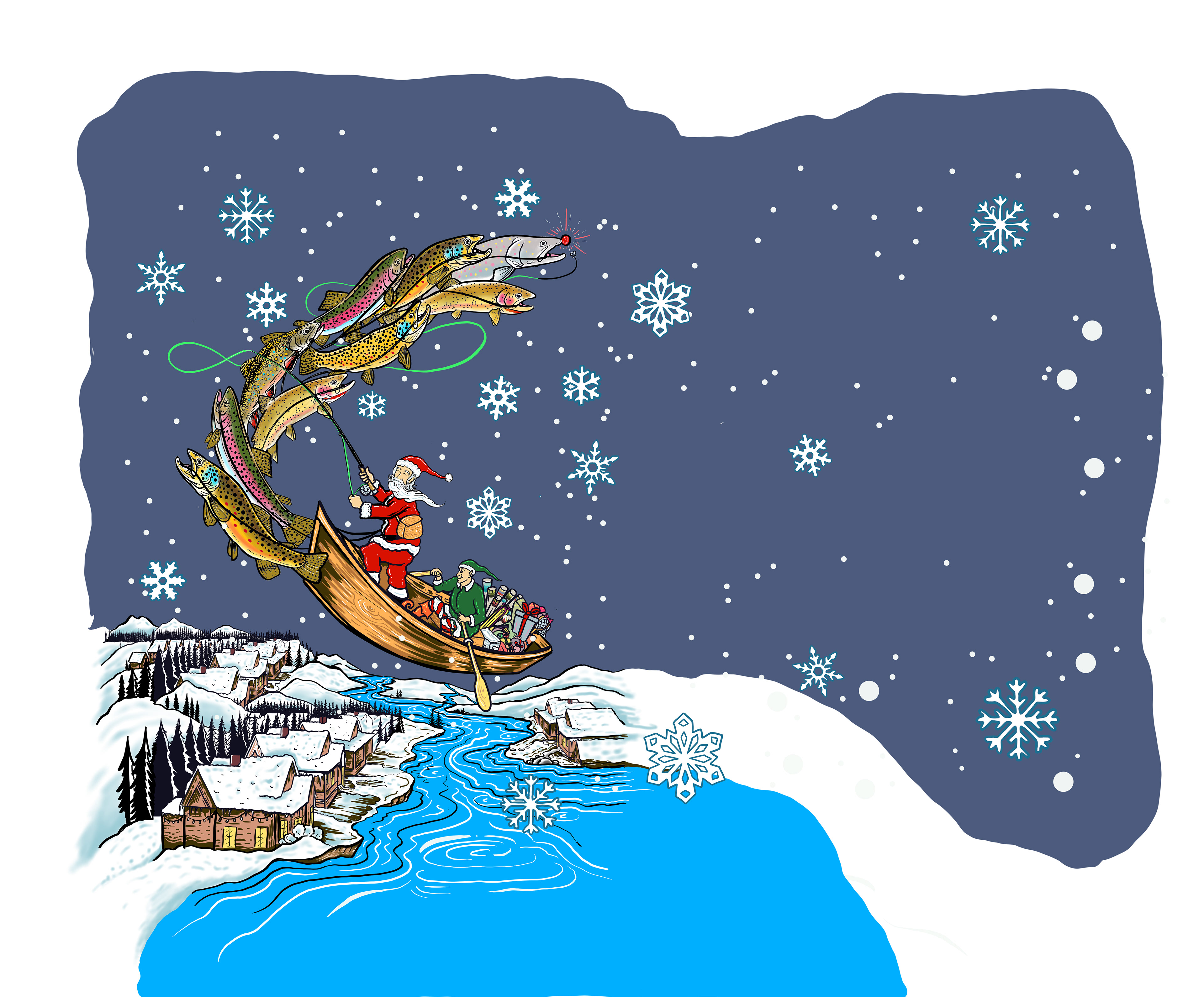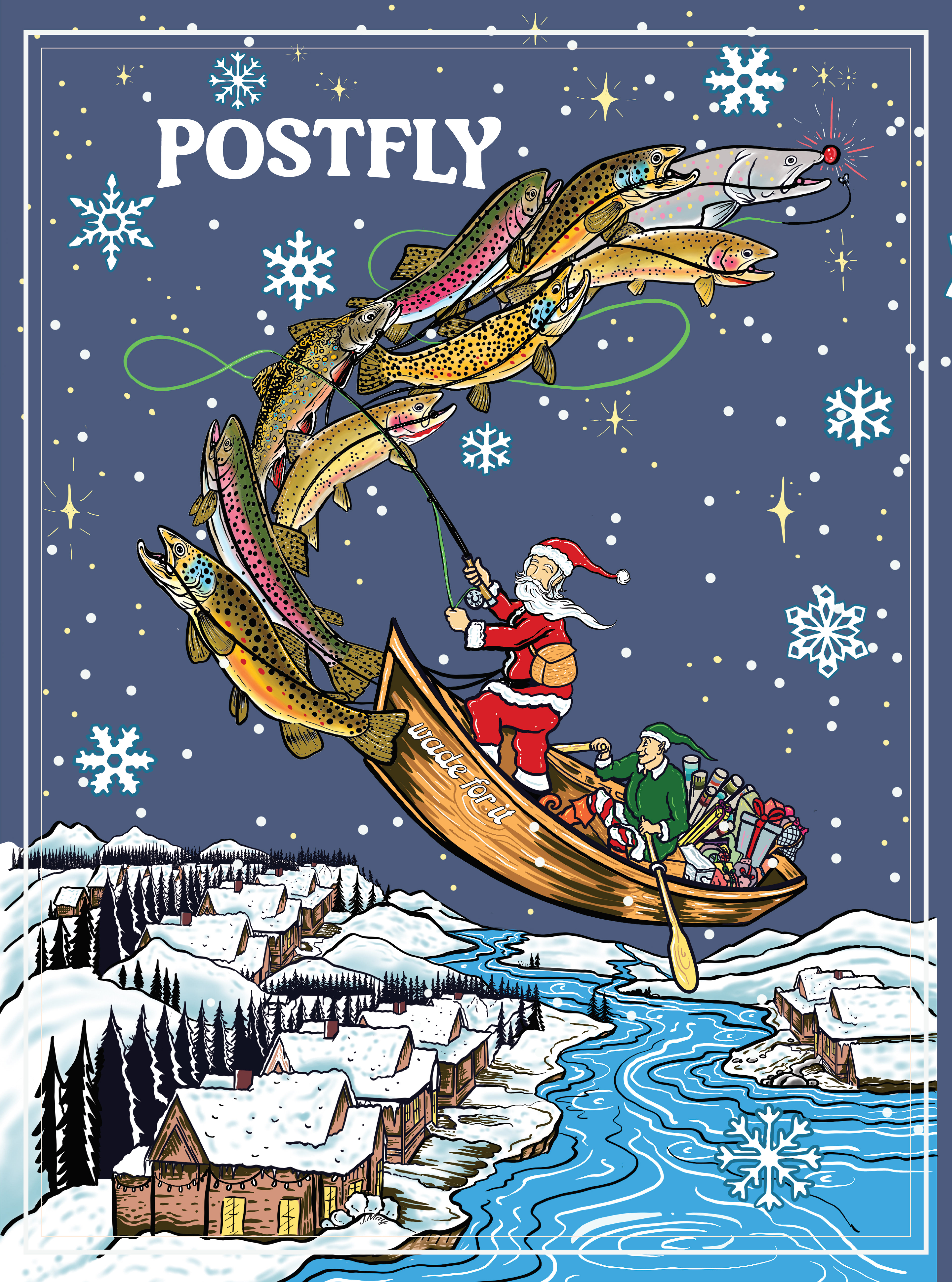 For the 2024 Advent Calendar, everyone liked the idea of Santa riding a drift boat pulled by trout. I quickly came up with this illustration including a bull trout leading a pack of browns, rainbows, cutthroat, and brook trout. This illustration was so popular with POSTFLY customers that they decided to have me reformat it for a jigsaw puzzle in 2024, which has proved to be a holiday favorite as well.